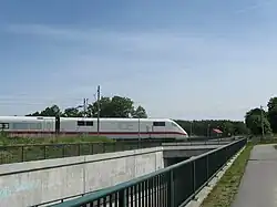 A new terminal building was built in the early 1980s. As a result of Die Wende (the change), express trains no longer stopped in Schwanheide after 30 September 1990.[8] With the upgrade of the line as part of the German Unity Transport Projects (Verkehrsprojekte Deutsche Einheit), the section between Hagenow Land and Büchen via Schwanheide was electrified in 1996. The tracks through the station were reduced to two through tracks and so the station was reduced in status to a Haltepunkt (meaning "halt", which in Germany describes a station without points). With a further upgrade of the line to a top speed of 230 km/h in 2004/2005, the level crossing near the station was replaced by an underpass.[9]