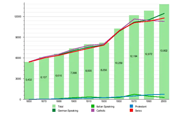 | Year | Total Population | German Speaking | Italian Speaking | Catholic | Protestant | Other | Jewish | Islamic | No religion given | Swiss | Non-Swiss |