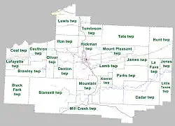 Townships in Arkansas are the divisions of a county. Each township includes unincorporated areas; some may have incorporated cities or towns within part of their boundaries. Arkansas townships have limited purposes in modern times. However, the United States census does list Arkansas population based on townships (sometimes referred to as "county subdivisions" or "minor civil divisions"). Townships are also of value for historical purposes in terms of genealogical research. Each town or city is within one or more townships in an Arkansas county based on census maps and publications. The townships of Scott County are listed below; listed in parentheses are the cities, towns, and/or census-designated places that are fully or partially inside the township. [19][20]