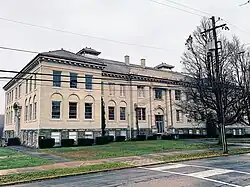 The Scottdale school district opened as multiple schools throughout the borough including North, Central and South grade schools. The original high school building was constructed in the late 1800s on the site of present day Chestnut Street Park.[27] The building was demolished in 1901 and replaced by a new school building directly across the street the same year. With the advent of the new school building, Scottdale's student body became known as the "Scotties" and began using the Scottish Terrier mascot with white and blue colors to represent the district. A football field was constructed behind the school building leading to the school instituting sports teams for the first time.