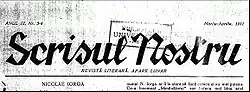 Scrisul Nostru was a monthly literary magazine published in Bârlad, Romania by the Academia Bârlădeană". The first issue of the magazine was issued in January, 1929 and it appeared, with some irregularity, until October 1931, a total of 21 numbers were printed.