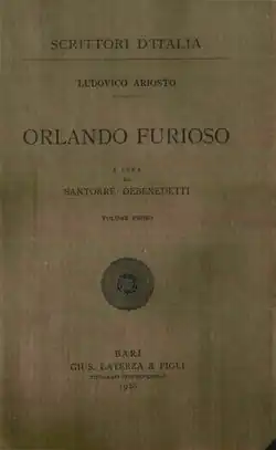 The Scrittori d'Italia ('Authors of Italy') was an Italian book collection, published by Giuseppe Laterza & figli from 1910 to 1987 in Bari.[1] The series was born with the intent to define and explain a cultural canon of the new Italy, disassociating from a culture yet considered too much based on the classic of the humanism, and choosing to represent also the civil history of the newborn Italian State. The original work plan included 660 volumes, of which 287 were actually published (including some second editions) for a total of 179 works.[1]