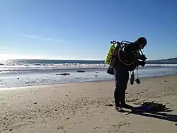 - Surf and beach entries: these are often complicated by breaking waves. A small break is not usually a problem, but a wave with sufficient energy to knock a diver over is usually best avoided, or managed by going under it if it cannot be avoided. The safe limit differs from diver to diver, and it depends on the equipment used. Going under the break requires wearing the mask and fins while the diver breathes through the regulator. It is easier to walk backward through a broken wave while wearing fins, and the type and height of the break will influence the difficulty. A plunging breaker is much more difficult and dangerous than a spilling breaker for both entries and exits.