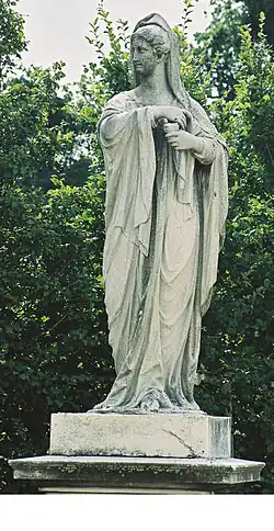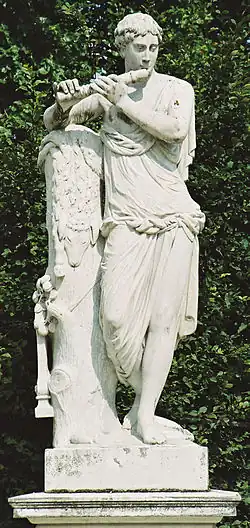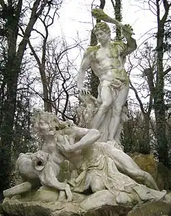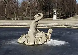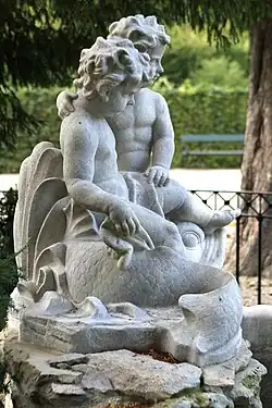 Appearing at the base of the grotto are four tritons—creatures who are half-man and half-fish—who are part of the sea-god's entourage. Each holds a conch shell trumpet with which they can inspire fear. They are restraining the sea-horses who draw Neptune's chariot across the seas.[41] This image of Neptune commanding the watery dominion was a common symbol in sixteenth, seventeenth, and eighteenth-century art, to represent monarchs controlling the fate of their people.[41] In the nineteenth century, a bank of evergreen trees was planted behind the white figural group to provide a dark contrast.[41]