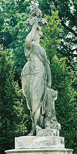 The retaining wall of the Neptune Fountain merges into the slope of the Gloriette hill and includes a balustrade adorned with ornate vases. From a projecting semi-oval plinth, a rocky formation emerges with the sea-god Neptune and his entourage. The plinth is segmented by panels decorated with masks and separated and embellished with garlands.[41] Neptune stands atop the grotto at the center of the figure group in a shell-shaped chariot holding a trident. A nymph is seated to his left. The sea-goddess Thetis kneels to his right, asking the sea god to favor her son Achilles on his voyage to Troy.[41]