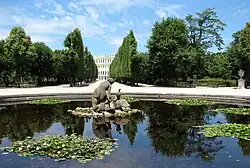 The Neptune Fountain at the foot of the Gloriette hill was designed to be the crowning monument of the Great Parterre.[41] Commissioned by Empress Maria Theresa, work on the fountain began in 1776 and was completed within four years, just prior to the death of the empress.[41] The overall design was done by Johann Ferdinand Hetzendorf von Hohenberg; the marble sculptural group was executed by Wilhelm Beyer.[41]