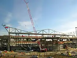 On September 22, 2006, Sound Transit and the Port of Seattle broke ground on the Airport Link extension, beginning three years of light rail and roadway construction.[48][49] The airport's return-to-terminal ramps were closed for demolition in October, clearing the site of the future station.[50] Construction of the SeaTac/Airport light rail station was bid out to Mowat Construction for $35.8 million in July 2007; the initial bid in March was set above Sound Transit's estimates at $95.3 million by Mowat, the sole bidder, and subsequently reduced the scope of the contract and removed elements of the station to bring costs down.[51][52] A second contract signed with Mowat in February 2008 brought the total cost of the station's construction to $72 million.[53] The 1.7-mile-long (2.7 km) light rail guideway approaching the station would be built by PCL Construction as $38 million addition to their contract to build the guideway in Tukwila.[54]