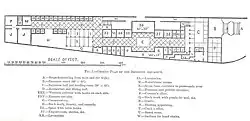 Interior layout of the aquarium in 1884. The main tank, the largest in the world, is marked "E".