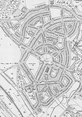 The Sea Mills area was entirely rural until the British government launched a heavily subsidised scheme after the First World War to build "homes fit for heroes".[15] The legislation did not receive royal assent until 31 July 1919. To ensure rapid implementation, however, that April Bristol Corporation had bought two farms on the southern edge of the King’s Weston Estate, on which to build a low-density garden suburb for the working classes to standards recommended in the Tudor Walters Report that the legislation was based upon.[16] The suburb takes its name from Sea Mills Farm, although the greater part was built over the former Clack Mill Farm, Shirehampton Road marks the boundary between them; the early 18th century Sea Mills farmhouse was to be preserved, but all buildings on Clack Mill Farm were demolished.[7]