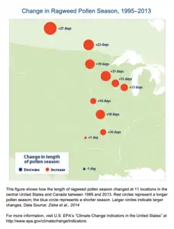 Observable changes in nature related to season creep include birds laying their eggs earlier and buds appearing on some trees in late winter.[13] In addition to advanced budding, flowering trees have been blooming earlier, for example the culturally-important cherry blossoms in Japan,[14][15] and Washington, D.C.[16][17][18] Northern hardwood forests have been trending toward leafing out sooner, and retaining their green canopies longer.[19] The agricultural growing season has also expanded by 10–20 days over the last few decades.[20]