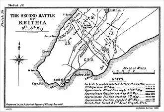 The Second Battle of Krithia (Turkish: İkinci Kirte Muharebesi) continued the Allies' attempts to advance on the Helles battlefield during the Battle of Gallipoli of the First World War. The village of Krithia and neighbouring hill of Achi Baba had to be captured in order for the British to advance up the Gallipoli peninsula to the forts that controlled passage of the Dardanelles straits. A small amount of ground was captured after two days of costly fighting, but the objectives remained out of reach.