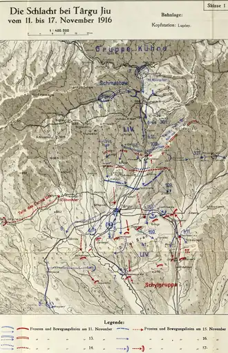 There is considerable disagreement between the German and Allied versions of the lead-up to the German breakthrough at the Jiu Valley. The Russian General Staff stated on 22 November that the German plan against Romania had completely failed, that Falkenhayn had failed at Predeal, and that he could only overrun Wallachia, instead of cutting it off in a pincer movement.[14] The German semi-official comment, however, claimed that it had never been the intention of their Supreme Command to break through in the southeastern Carpathian passes, trying to make out – in reaction to their defeats in the passes south of Brassó (Brașov) and on the Moldavian frontier – that these had always been part of a maneuver which aimed at attracting and binding Romanian forces in an area away from the Jiu Valley, the place singled out for the main attack. The truth was probably that the German Supreme Command acted on a plan which, if successful, would have achieved an overwhelming victory, but even if only partially carried out, would have given them the means to achieve remarkable though less overwhelming successes.[4]: 435 With the eastern Carpathian passes eliminated, the southern route from Brassó (Brașov) to Bucharest and the Danube offered the greatest potential for crushing the Romanian Army. Both the German and Austro-Hungarian commands favored this approach. However, the Romanians expected their enemies to choose that route, and accordingly they had constructed formidable defenses in the passes south of the city before the war started. Taking into consideration the worsening weather and the situation of the railways, Erich von Falkenhayn decided to achieve his breakout in the westernmost mountain passes. That being said, Falkenhayn had not entirely given up hope of breaking through the Romanian defenses south of Brassó (Brașov). He sent his divisions east and south of the city to both keep pressure on the Romanians and — with luck — break through the Romanian defenses. General Curt von Morgen, one of Falknehayn's subordinates, argued that much more of the Romanian Army could have been captured if a breakthrough would have been achieved at Câmpulung instead of the Jiu Valley. He insisted that this would have achieved "a real victory, a Cannae, a Tannenberg".[3]: 156–157, 300 Falkenhayn planned to apply pressure at several different points across the mountains and then exploit a success wherever it was achieved.[5]: 370–371