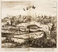 The siege started on 21 July, the city was well prepared compared to the other cities that Bernhard previously captured. The city was defended by a garrison of 2.500 men under Carl von Rabenhaupt.[18][19] On 26 July, the Münsterite forces carried out their first bombardments of the city, these bombardment would earn Bernhard the nickname 'Bommen Berend'.[20] For weeks, the Münsterite forces tried to unsuccessfully bombard the city, but to no avail. Eventually, on the 27th of August, Bernhard hard to retreat due to their men starving and a guerilla campaign in Friesland carried out by Hans Willem van Aylva against their supplies.[21][20]