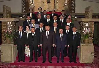 Prime Minister Yoshirō Mori (front row, centre) with his reshuffled cabinet inside the Kantei, December 5, 2000
