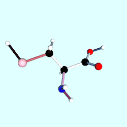 Selenocysteine is the Se-analogue of cysteine. It is rarely encountered outside of living tissue (nor is it available commercially) because of its high susceptiblility to air-oxidation. More common is the oxidized derivative selenocystine, which has an Se-Se bond.[9] Both selenocysteine and selenocystine are white solids. The Se-H group is more acidic (pKa = 5.43[3]) than the thiol group; thus, it is deprotonated at physiological pH.[10]