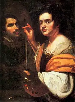 It is assumed that the sitter in the painting is the patron that commissioned it, but there is no evidence to support any clear identification. Artemisia's pose has led art historians to see the painting as a direct challenge to a viewer. Mary Garrard has interpreted this in the context of Artemisia's gender, i.e. a challenge to male artists of the time. This contention is made based on the shape of the painting hand, as this gesture in the 17th century represented a "challenge advanced by those confident in the strength of their abilities."[4] Locker continues the idea of the painting as a challenge, but situates it in the context of the literary and poetic culture of the times, where Gentileschi is challenging poets, "whose spoken paintings ... cannot rival her painted poems."[3]