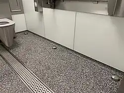 A self-cleaning floor is a surface that has the ability to clean itself without external action. This is usually accomplished through automated pods set to dispense water regularly, but can also be accomplished through the use of materials that naturally reduce pathogens. Such floors are designed to stay hygienic with little maintenance, and are most often installed in places that require constant maintenance and cleaning, such as hospitals and washrooms. In Europe and a few African countries, many ceramic tiles and sanitary ware manufacturers have products on the market with self-cleaning features.[1]