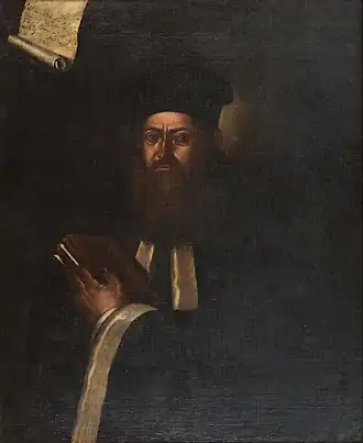 Self-portrait with Psalter is an oil painting created by Nikolaos Koutouzis. The work was completed between 1761 and 1813. Koutouzis was a member of the Heptanese School of painting. He was also a priest and poet. There are over 136 paintings attributed to him, of which fifteen were portraits. At some point in his life, Koutouzis was involved in a brawl, and his face was permanently scarred. Koutouzis' teachers included Nikolaos Doxaras and Giovanni Battista Tiepolo. Both artists completed some portraits throughout their artistic careers. Koutouzis lived in Venice from 1760-1765, studying at the workshop of Tiepolo. Koutouzis later became a teacher and taught Nikolaos Kantounis, who also completed portraits.[1][2][3]