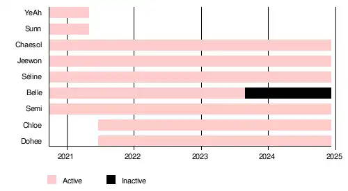 ![]() Cignature in December 2021 L–R: Chloe, Chaesol, Semi, Dohee, Jeewon, Seline, and Belle | |