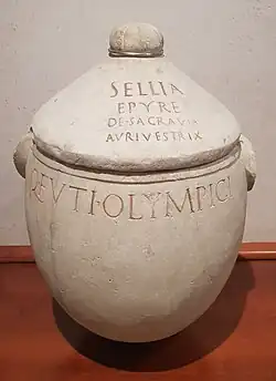 - A marble cinerary urn reads on the lid, 'Sellia Epyre, dressmaker in gold in the Via Sacra'. On the body of the urn is the male name Q. Futus Olympicus in the genitive case. This has been interpreted as meaning either that Q. Futus Olympicus made the urn for his wife Sellia, or that Sellia made the urn for him and had her ashes added to it on her death.[3]