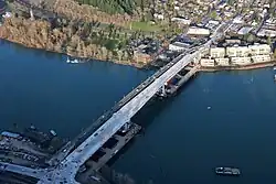 On January 19, 2013, the 6.8-million pound bridge was moved onto temporary steel supports by contractor Omega Morgan.[20] The moved bridge, known as a shoofly bridge,[21] served as a temporary span until the new crossing opened. After more than three years of use on temporary supports, the old bridge closed to traffic permanently on February 25, 2016, and the new bridge opened to traffic on February 29, 2016.[2] In between, on February 27, an opening celebration event took place on the new span with access to pedestrians and cyclists only. Crews began demolishing the original railings and bridge deck once the old span closed, with the process completed in May 2016. The steel trusses were then cut into pieces and lowered onto barges using hydraulic jacks, and the temporary steel supports were dismantled.