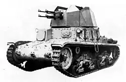 To save time and materials, the hull of the M15/42 tank was used as the basis for the quadruplo: The original turret was removed and replaced with a polygonal welded open turret, containing quadruple 20 mm-Scotti Isotta Fraschini 20/70 guns, with -5° to + 90° elevation; the autocannon had been specially modified so they could use disintegrating link belt ammunition resulting in an increased rate of fire 600 rounds per minute per gun.[1] The only other change involved the removal of the two Breda 38 machine guns in the hull, the openings for which were covered by 42 mm (1.7 in) armour plate; the crew was reduced to three, two in the turret and one in the driver position in the hull. The first prototype was completed by January/February 1943 and was presented for trials at the Centro Studi Motorizzazione dell'esercito: weighing 14.7 t (16.2 tons) at 2.55 m (8 ft 4 in) high, capable of operating up 60% slopes.