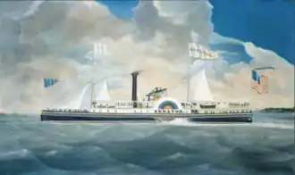 The ship was rigged as a two-masted schooner and could sail, but her primary propulsion was provided by side-mounted paddle wheels, 30 feet (9.1 m) in diameter.[4] These were driven by a coal-fired, single-beam steam engine that produced 450 horsepower. The single cylinder had a bore of 50 inches (1.3 m) with a stroke of 11 feet (3.4 m).[5] The engine was built in New York City at the Archimedes Iron Works of H. R. Dunham.[6]