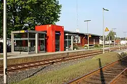 In May 2011, the upgrading of the line began at Hövelriege station, where a new platform was built on the opposite side of a level crossing. Train running in each direction now stop after this level crossing, so that the crossing barrier remains closed only for a short time. A new station called Bielefeld-Senne was built between September and the timetable change in December 2011.[9] It replaces the station of Brackwede Süd,[8] but it is planned to reopen this station later or to rebuild it closer to Brackwede as a barrier-free platform. There are currently discussions on locating it near the IKEA furniture store instead.