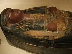 His head and chest were covered by a funerary mask made of cartonnage. Despite the style of the ushabti dating the burial to the reign of Tutankhamun, the mask has features more typical of the reigns of the earlier kings Amenhotep III or Thutmose IV.[18] On top of the chest and abdomen of his mummy were bunches of white lotuses with their stems tied in loops and three garlands made of vine and willow leaves.[19] Beneath these was a heart scarab on a multi-stranded, multi-coloured beaded necklace; an additional pectoral-necklace had fallen beneath the body. A headrest wrapped in strips of fabric and five cubit rods were placed around his legs. At the level of his feet were five small vessels of bronze.[20]