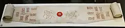 Senninbari were decorated with 1000 knots or stitches, and each stitch was normally made by a different woman.[1][2] Senninbari were typically 15 centimetres (5.9 in) wide and ranged from 90 centimetres (3.0 ft) to 120 centimetres (3.9 ft) or more in length. Each end of the belt could feature strings, snaps or buttons that allowed it to be fastened around the waist; examples lacking these were often tucked into the waist. Very long types of senninbari, called tasuki, could be worn criss-cross fashion over the chest, shoulders and back. Other variations were never worn, but may have been folded and placed inside helmet liners, pockets or packs.[1]