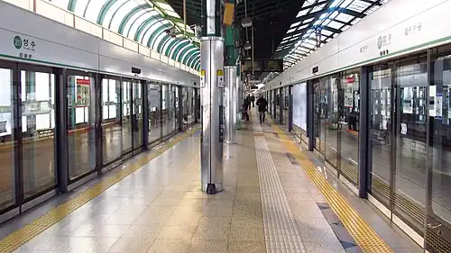 Seongsu Station (Korean: 성수역) is a rapid transit station on Seoul Subway Line 2. It is located in Seongsu-dong in the Seongdong-gu administrative district of Seoul. It is also the southeastern terminus of Line 2's Seongsu Branch to Sinseol-dong. Trains needing to be serviced take the Seongsu Branch from this station and go to the Gunja Train Depot behind Yongdap Station.