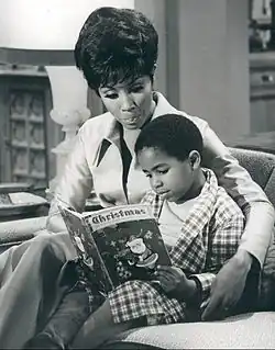 • Julia, described by one critic as "the first non-Negro-stereotype TV situation comedy to star a Negro actress",[59] premiered at 8:30 Eastern time on the NBC television network and began a three-season run. Actress and singer Diahann Carroll portrayed Julia Baker, a recently widowed black nurse, with Lloyd Nolan in a supporting role as Baker's white boss and Marc Copage as her 6-year-old son, Corey. Another child actor, Michael Link, appeared as Corey's white friend, Earl J. Waggedorn. Hal Kanter was the creator-producer of a show that was generally praised by television critics. One critic noted that the situation comedy "is very low pressure, admirably without a laugh track, and weaves in warmth, bite and a social needle... of course it must deal at times with black-white relationships, but it is not, and does not pretend to be, a social tract", adding, "It has been suggested by some that 'Julia' is not going to give a true representation of Negro life, and that may very well be so. On the other hand it might be argued that white situation comedies hardly give a true representation of white life in the United States. This may not be anything to cheer about overall, but it seems unfair to expect 'Julia' to solve all the world's problems."[60] Another critic noted that the premiere episode's "frequent reference to skin color... is rather unusual", acknowledging that "Before this, there was I Spy, but that series blandly ignored the fact that Bill Cosby was a Negro", and noting that the sitcom "shapes up as a benign, light half hour, brightened by Miss Carroll's good looks and charm and warmed by the cute little boy who plays her son."[61]