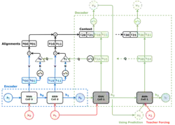 A standard method for training is "teacher forcing". In teacher forcing, no matter what is output by the decoder, the next input to the decoder is always the reference. That is, even if , the next input to the decoder is still , and so on.