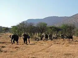African bush elephant herds recovered from a population low in the 1980s caused by poaching, and numbered over 5,000 individuals by 2014.[17] The African buffalo population declined between 1976 and 1996 due to poaching, but increased to 28,524 individuals by 2008.[18] The Eastern black rhinoceros population was reduced to about 10 individuals in the 1980s due to poaching, and fewer than 70 individuals survive in the park today.[19] Rhinos mostly browse on grasses, woody Indigofera, Acacia and Crotalaria forbs and shrubs.[20] An estimated 3,520 Masai giraffes lived in the park in 2010, down from 10,750 in 1977.[21] The giraffe population stabilized in the center of the protected area since 2010, but continued to decline in edge areas.[22]
