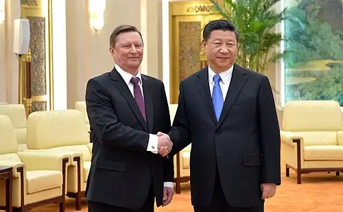 In December 2011, Ivanov was appointed Chief of Staff of the Presidential Administration of Russia.[29] He was noted for his hawkish views during the Russo-Ukrainian War and towards the West and his major role in lobbying for the Russian military intervention in the Syrian Civil War.[30]