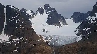 The island is located on the shores of Davis Strait, separated from Maniitsoq Island in the south by the Ammarqoq Sound, and from the mainland in the east by the Ikamiut Kangerluarsuat fjord.[2] The island is very mountainous and glaciated in the north, with several distinct mountain peaks. The highest point on the island is 1,031 metres (3,383 ft).[1]
