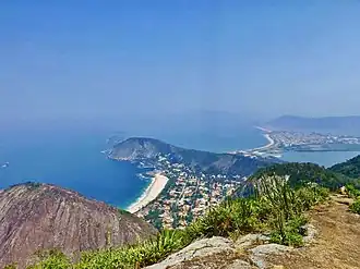 The Serra da Tiririca State Park is divided between the municipalities of Niterói and Maricá, Rio de Janeiro.[1] It has an area of 3,493 hectares (8,630 acres).[2] This includes a marine park that extends 1,700 metres (5,600 ft) offshore between Pontas do Alto Mourão and Costão de Itacoatiara. It has rugged terrain with slopes above 50° in some places. The average altitude is around 286 metres (938 ft). The park includes eight hills, namely Morro do Elefante: 412 metres (1,352 ft), Alto Mourão: 369 metres (1,211 ft), Costão de Itacoatiara: 217 metres (712 ft), Morro do Telégrafo: 357 metres (1,171 ft), Morro do Catumbi: 325 metres (1,066 ft), Morro da Penha: 128 metres (420 ft) and Morro da Serrinha: 277 metres (909 ft).[1]