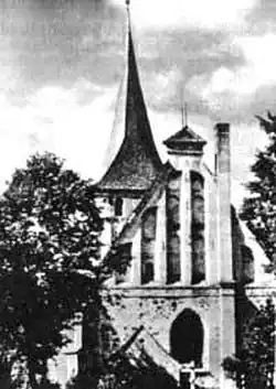 Much of the village was dismantled by French troops to create barracks in June 1807 during the War of the Fourth Coalition.[7] Politically active students from the University of Königsberg held a commercium in Quednau in 1839. On 18 October 1863, a celebration was held in Quednau by Königsberg's men's gymnastics club to commemorate the fiftieth anniversary of the Battle of Leipzig.[8] The community's church was the Gothic Quednau Church. The Fort III König Friedrich Wilhelm, named in 1894, was built near Quednauer Berg as part of the new Königsberg fortifications constructed from 1872 to 1894.