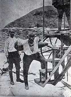 ![]() Corporal Seyit posing with a wooden replica of the shell. After the battle he was not able to reenact his deed for the photographer. | |