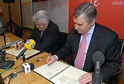 After Plaid Cymru won 15 seats at the 2007 assembly election, Jones began negotiations with Nick Bourne of the Conservative Party and Mike German of the Liberal Democrats to form a coalition government and topple Rhodri Morgan's Labour government.[32][1] An agreement was negotiated where Jones would become First Minister of Wales and lead a cabinet with nine members, including four Plaid Cymru AMs, three Conservative AMs and two Liberal Democrat AMs. The Conservatives and Liberal Democrats would each appoint a deputy first minister who would serve on an equal footing with one another. Plaid Cymru had also negotiated an alternative confidence and supply agreement with Labour but suspended negotiations after the Plaid assembly group approved the agreement with the Conservatives and the Liberal Democrats. The Conservatives also backed the coalition. A meeting of the Welsh Liberal Democrat executive on 22 May failed to approve the agreement with a tied vote, leading to a last-minute collapse of the agreement.[33] Plaid resumed negotiations with Labour and on 19 July they formed the One Wales coalition government with Jones as Morgan's Deputy First Minister in a cabinet made up of three Plaid Cymru AMs and seven Labour AMs.[34][35] Plaid Cymru became a party of government for the first time in its history, leaving opposition.[36]