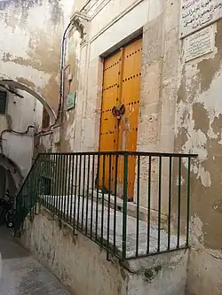 From the street, a staircase climbs to the entrance where a bent passage leads to a central square courtyard. Across the courtyard, opposite the entrance, is a small vaulted prayer hall. In the middle of the other two sides of the courtyard are vaulted rooms, entered through large arches, which were probably classrooms. A second floor exists, with a gallery around the courtyard leading to 19 small bedrooms for students. A second, larger prayer hall is also found on the upper floor, directly above the ground floor prayer hall.[2][1] The layout, in which the entrance and major rooms of the ground floor are aligned symmetrically with the two central axes of the building, may have been inspired by the layout of madrasas in Egypt or further east. It also resembles the layout of traditional houses in the medina of Tunis,[2] and the building may have been a former house that was remodeled and repurposed into a madrasa.[5] Due to its later renovations, none of the madrasa's original decoration, if it had any, has survived.[2]