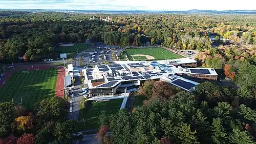 The old Sharon High School building was originally constructed in 1956, to replace the Charles R. Wilber School, which served as the town's high school before 1957.[5] The high school grounds includes a track and field complex to the southeast, baseball field, softball field and five tennis courts to the south.[6]