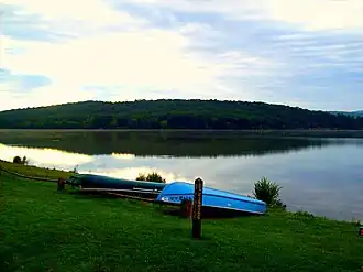 The bedrock at the park consists of the Devonian Brallier Formation, Harrell Formation, Mahantango Formation, and Marcellus Formation. These formations are all dominantly shales and siltstones, which dip to the southeast at approximately 20-30 degrees. The park lies at the southern end of Chestnut Ridge, which is a broad, doubly plunging anticline. Some of the shales (probably the Harrell Formation) outcrop along the shores of the lake, particularly the southern shore near the dam.[6]