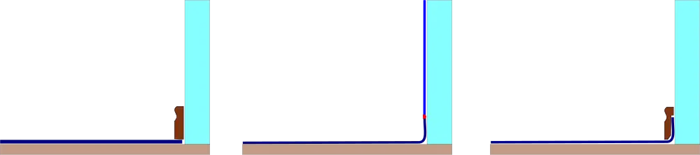 Bathtub floors may join the sheet flooring to the wall after bending it up the wall like skirting-board. As the vinyl is impervious, they help avoid water infiltration into the subfloor, and are most common in wetrooms. Sheet flooring may also be used with conventional skirting board, in imitation of rigid flooring. A concealed bathtub floor may be hidden behind skirting board (if the lower part of the back of the skirting board is cut away) or under a built-in cabinet. This also decreases the precision with which the sheet must be cut.