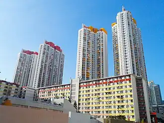 At the north of Shek Kip Mei is Tai Wo Ping (大窩坪), along Beacon Hill. This was a cottage area (a type of resettlement accommodation) from the 1950s to 1970s, but it has been developed into a public housing estate, Chak On Estate (澤安邨), and two private housing estates, Beacon Heights (畢架山花園) and Dynasty Heights (帝景峰).[4][5]