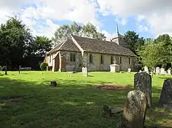 The Anglican church of St. Giles (TQ 214 188) is well away from the modern roads, approached along a tree-lined bridleway leading to Shermanbury Place, east of the Brighton road. A small church is mentioned in the Domesday Book, but the present structure is of 14th-century origin. The roof is made from Horsham stone slates with a weatherboarded bell tower at the west end, containing two bells. The door and stone roofed porch are at the west end.[11][12][13] Inside 18th century pews have the names of farm houses to which they were allocated painted on the backs: Perrymans, Sakeham, Vadgers, Pooks, and so on. It is now locked, but the church warden will show people round on request. Its wildflower-rich graveyard is untouched by burials since it was declared full in 1888.[8]