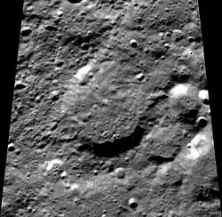 This is an old, eroded crater with an outer rim that is rounded and somewhat irregular. The northern part of the rim has a wider inner wall, and there is a small crater along the north-northwestern edge. The interior floor is relatively level, but uneven, particularly in the northern half.