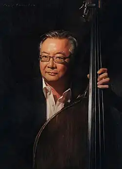 Shinji Eshima plays on the 1843 Charles Plumerel bass that is seen in the Edgar Degas 1870 c. oil on canvas painting The Orchestra at the Opera which hangs at the Musée d'Orsay in Paris (an oil sketch of the work is owned by the Fine Arts Museums of San Francisco and is often on display at the Legion of Honor Museum in San Francisco).[9] The bass was depicted again in the oil portrait, Shinji Eshima with Plumerel Bass, by artist Scott Wallace Johnston in 2012. An inscription on the bass states that Plumerel's instrument imitated Stradivari, but it is unconfirmed whether or not the bass is a copy of an instrument made by Antonio Stradivari.[10] The bass was originally owned by Achille Henry Victor Gouffé, a soloist of the Paris Opéra who performed with the company for 35 years and appears with the bass in the aforementioned Degas painting (Gouffé was 66 years old at the time). The bass has since been performed with the Metropolitan Opera, New York Philharmonic, NBC Symphony Orchestra, and New York City Ballet. Eshima's Juilliard teacher, David Walter, was the principal bass of the New York City Ballet orchestra and he played the Plumerel for more than 30 years. Six years after Walter's death, it was passed on to Shinji Eshima. The bass was first performed at the War Memorial Opera House in 2008 during the 75th anniversary of San Francisco Ballet.[10]
