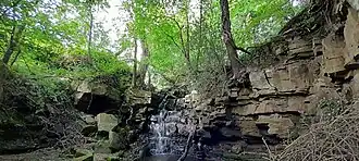 The other can be accessed up a set of small stone stairs from the road on crossing the bridge across the Derwent to the right (east). This path leads along the north bank of the River Derwent, through first a large field on the opposite side of the river to the Shotley Bridge Cricket Club, then a small wooded nature reserve including the artificially created Price Pond (Google Maps) / wetland and stream, a farm at the top of the following hill, and eventually to the Northumberland hamlet of Newlands. This path has the nickname Waterfall Way due to there being one small waterfall on Mere Burn and two on Small Burn close to the Newlands end of the path. The two near Newlands are also referred to as Sisterson Falls with reference to a nearby farm.
