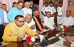 Shri Bhagwan Singh Kushwaha is a politician from Bihar, who has also served as a minister in the Government of Bihar. He is a son-in-law of Jagdish Mahto— the founder of Naxalism in Ekwari village of the Bhojpur region of Bihar.[3] He has assumed several important posts in various regional political parties of Bihar, which include Communist Party of India (Marxist–Leninist), Rashtriya Janata Dal, Janata Dal (United), Lok Janshakti Party, Jan Adhikar Party Loktantrik and Rashtriya Lok Samata Party.[4][5] Kushwaha once headed JD(U)'s youth wing and has also been Minister for rural development in Bihar.[6] In July 2024, he was elected to the Bihar Legislative Council. He was nominated by the Janata Dal (United) as its candidate to fill the vacancy of the post caused by end of the tenure of another leader of the party.[7]